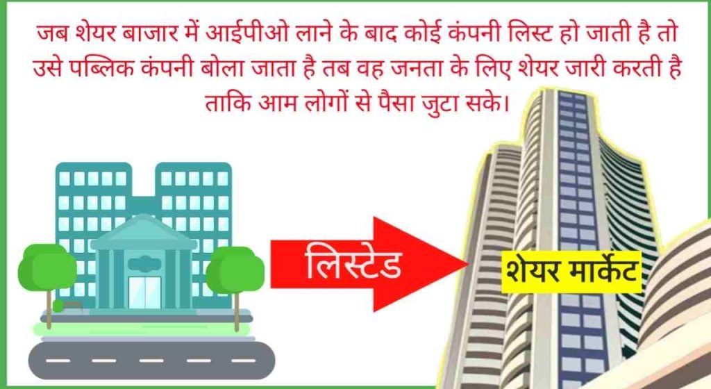 तो अब आप पहली बार अपनी कंपनी के शेयर बेचने जा रहे हैं और आपको 10 लाख रुपये की जरूरत है तो आप ₹100 के हिसाब से 10,000 शेयर निकालेंगे और इसी को बोला जाता है IPO यानी Initial Public Offering मतलब कि जब कोई कंपनी पहली बार अपने शेयर निकालती है और शेयर मार्केट पर लिस्ट होती है तो उसे ही IPO बोलते हैं . इसके बाद जब लोग आपकी कंपनी के शेयर्स को खरीदेंगे और जब सारे शेयर बिक जाएंगे तो हमें 10 लाख रुपये मिल जाएंगे अपने बैंक account में।